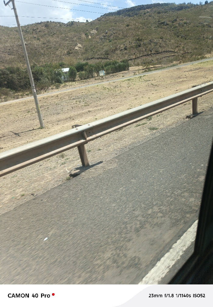 The image depicts an arid, rural landscape in Gilgil ward, Kenya, viewed from the interior of a moving vehicle through a window. In the immediate foreground, a blurred gray asphalt road surface is visible, partially obscured on the right by a dark vertical element consistent with a window frame and a light-colored curb. Extending horizontally across the midground is a light-colored metal crash barrier (guardrail) supported by several brown posts, casting shadows onto the dry, light-brown ground beyond it. Beyond the crash barrier, a narrower, unpaved dirt track runs parallel to the main road. A utility pole with power lines is positioned to the left of this track. Further back, nestled among green trees and shrubs, a small, white or light-colored rectangular building with a simple roof is visible. To its right, partially obscured by foliage, is another smaller, light-colored object or structure. The background features a large, dry hill or mountain range, characterized by brown-green scrub vegetation and rocky outcrops. The sky above is light blue with sparse white clouds. No people, animals, actions, or interactions are discernible within the scene.