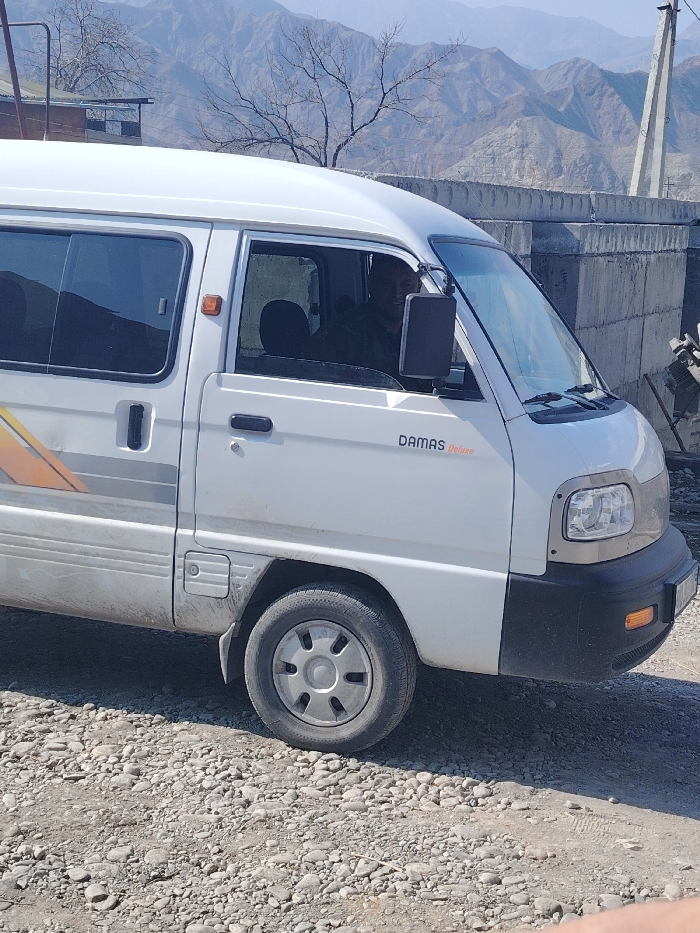 A white Daewoo Damas Deluxe minivan is parked on a gravel road with a mountain backdrop