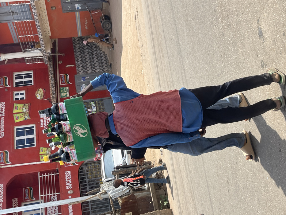 An outdoor urban scene in Jos, Nigeria, depicts multiple individuals on a sunlit street. In the foreground, a person faces away from the camera, balancing a green plastic crate filled with glass bottles of beverages (some labeled "GHANA" and "NEW GHANA," the crate bearing a "7UP" logo) on their head. They are wearing a light blue long-sleeved shirt, a red mesh vest, black trousers, and light green sandals. A pinkish-red cloth covers their head beneath the crate, and their left arm is raised. Immediately to their left, another person walks alongside, partially visible, wearing light blue jeans and tan slides. Further left and behind them, a young boy walks away from the camera, dressed in a black and white long-sleeved shirt (with "CR7 JR" visible) and blue jeans. The background is dominated by a two-story red-orange building featuring white-framed windows and prominent "Indomie" noodle advertisements, including text "Tasty Nourishment for SUCCESS!" and images of noodle packets and a prepared dish. To the right, an adjacent reddish-orange building shows a patterned wall section and a metal door, with a person in light brown attire bending near a two-wheeled handcart in the distance. The ground consists of asphalt road in the foreground and a dusty, light brown dirt area to the right. A light-colored sedan is partially visible in the mid-ground to the left, and a white pole and corrugated metal sheets are on the far left. Shadows are distinct, indicating bright sunlight.