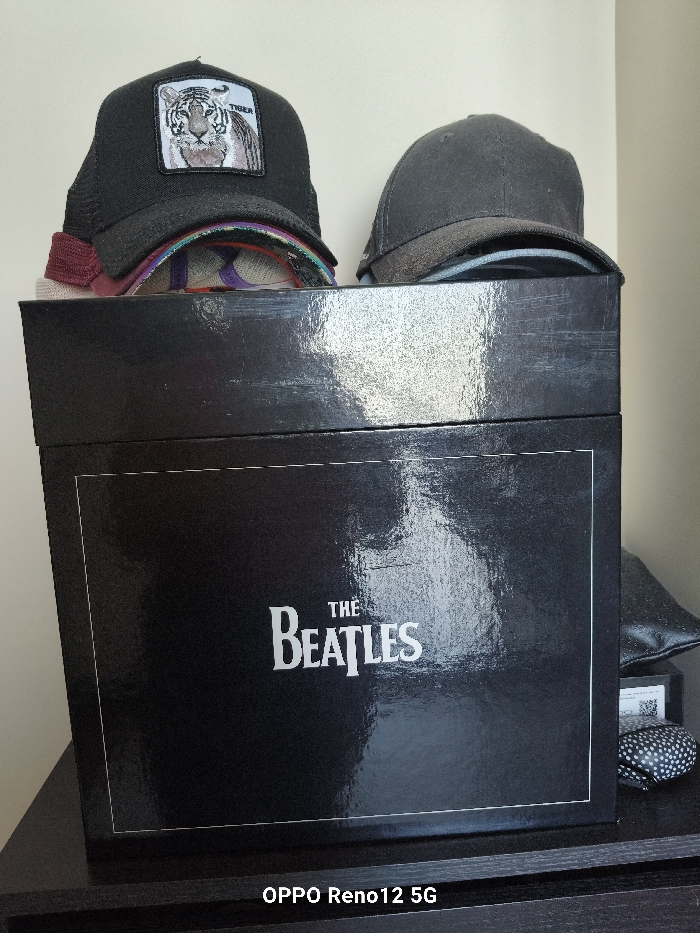 This image depicts a static indoor scene, presumed to be located in the city of Cuéllar, Spain. The central subject is a glossy black rectangular box, positioned vertically and occupying the majority of the lower and central frame. The front face of the box prominently displays the white capitalized text "THE BEATLES," framed by a thin white border. Stacked atop the black box are multiple baseball caps. The uppermost cap on the left is black, featuring a white square patch on its front with an embroidered depiction of a tiger's head and the word "TIGER" above it. To the right of this, another dark-colored (likely black or dark grey) baseball cap is visible. Below these two, several other caps are partially visible, exhibiting various colors and patterns, including maroon and multicolored designs. The box and accompanying items rest on a flat, dark surface, possibly a black or dark brown wooden table or shelf. To the immediate right of the box, on the same dark surface, partially visible objects include a dark, possibly padded item (resembling a small cushion or bag) and a smaller, dark accessory featuring white polka dots (potentially a rolled-up tie or handkerchief). A white label with a black QR code is partially visible behind these smaller items. The background consists of a plain, light-colored wall, appearing off-white or beige. No human subjects or discernible actions are present. A digital watermark stating "OPPO Reno12 5G" is present at the bottom center of the image.