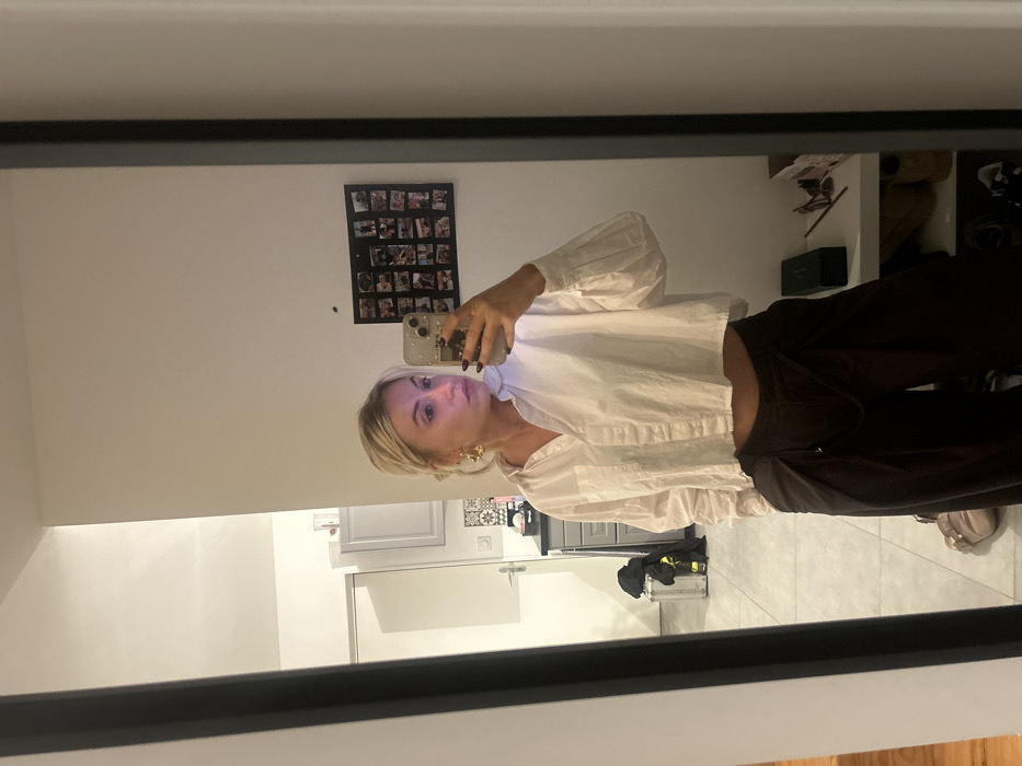 A mirror selfie captures a blonde woman wearing a white blouse and dark pants