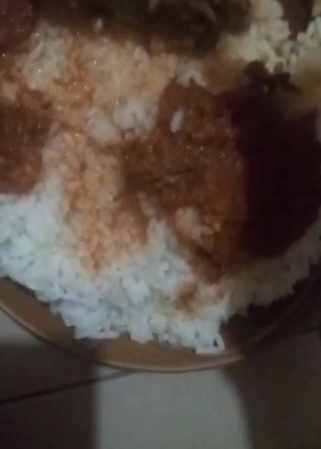 plate of white rice topped with a brown sauce. A fork is visible on the plate. The plate sits on a tiled surface. The camera is held above the plate and the shot is somewhat blurry.