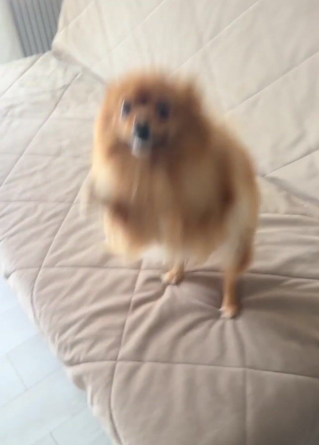 Pomeranian dog on a light-colored, quilted bed. The dog stands on its hind legs, waves its front paws, barks, and then sits on all fours. It looks toward the camera, barks again, and walks away. The background is a room with striped wallpaper and a side table.