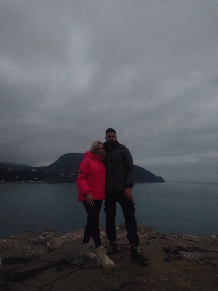 The image displays two individuals, one female and one male, positioned on a rocky outcrop overlooking a body of water, identified as being in Partenit, Ukraine. The female, on the left, has blonde hair and wears a bright pink puffer jacket, dark pants, and light-colored platform boots. Her left arm is around the male's lower back. The male, on the right, has dark hair and a beard, wearing a dark olive-green winter jacket, dark pants, and dark boots with bright yellow laces. His right arm is around the female's shoulders. Both are looking towards the camera, with the female smiling and the male maintaining a neutral expression. In the midground, a dark body of water, likely the Black Sea, extends to the horizon under an overcast grey sky. To the right in the background, a large, dark, vegetated mountain rises from the sea. Along the left coastline, several buildings are visible nestled against the landmass. The foreground consists of dark, rugged rock formations. The overall lighting is dim and diffused, consistent with an overcast day.