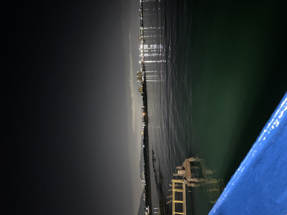 The image displays a nighttime waterfront scene in Puerto La Cruz, Venezuela. The foreground features a blue, textured railing, likely part of a boat or pier, occupying the lower-left to lower-right quadrant. To the left, a dilapidated, rusty metal structure with yellow railings extends from the water, suggesting remnants of an old dock or pier. Beyond this, a darker, partially submerged structure is visible in the water. The midground is dominated by a body of water, dark green in the foreground, transitioning to a reflective surface in the distance where city lights cast bright, elongated reflections. The background reveals the illuminated skyline of Puerto La Cruz across the water, comprising multiple buildings and structures. Distant mountains are faintly discernible on the far left horizon beneath a dark, overcast sky. No individuals, explicit actions, or interactions are present.
