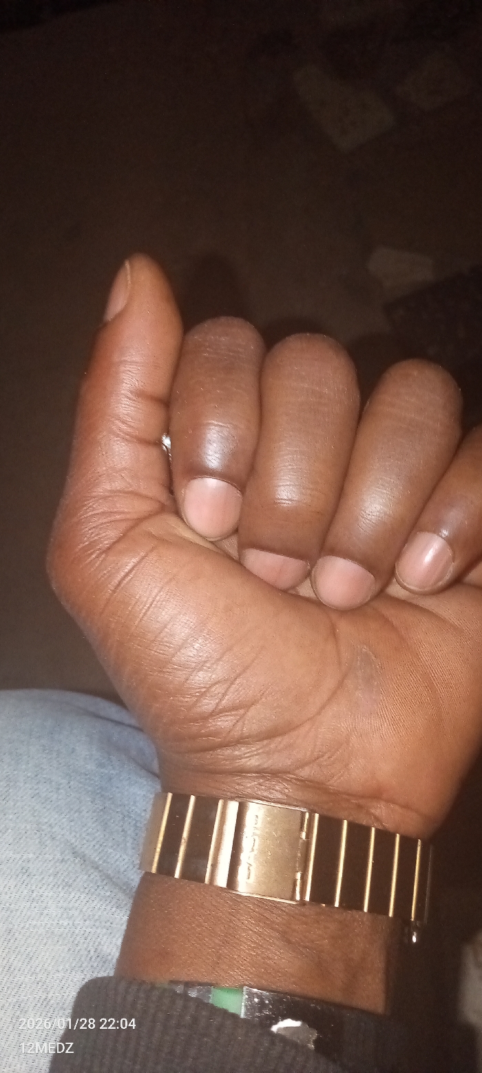 A dark-skinned hand is clenched, displaying short, well-manicured nails