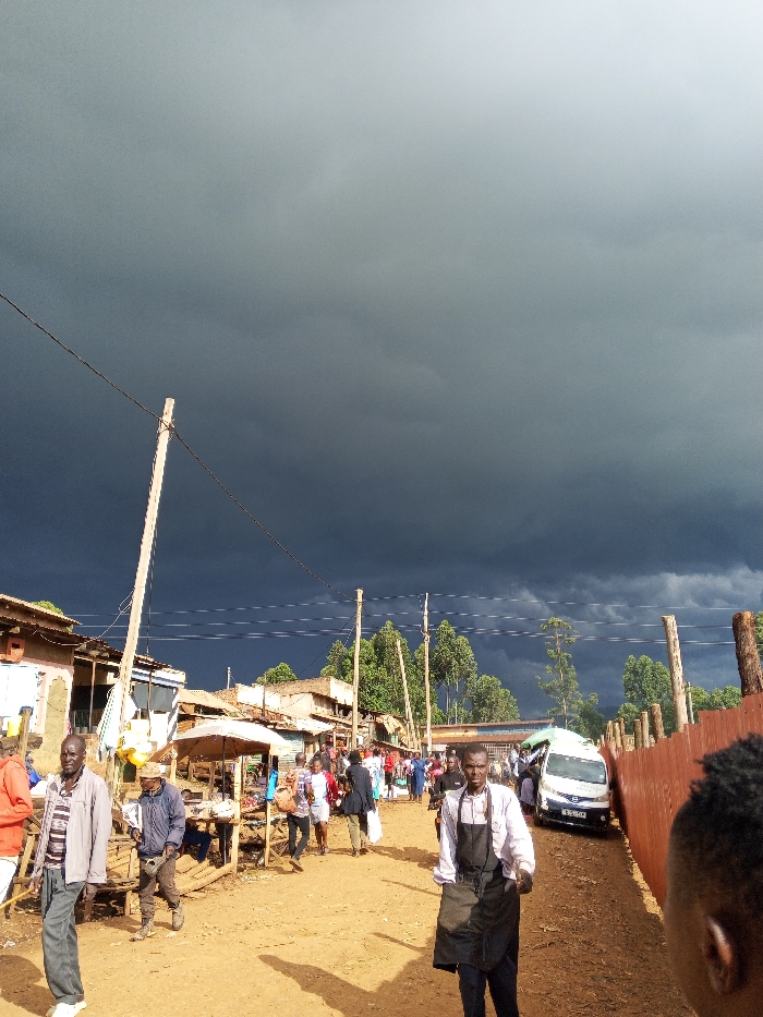 - "This image depicts a bustling outdoor market scene in Borabu Chitago ward, Kenya, under a heavily overcast sky dominated by dark grey clouds, indicative of impending rain or a storm" by FM-ybuqj2, licensed under CC BY 4.0