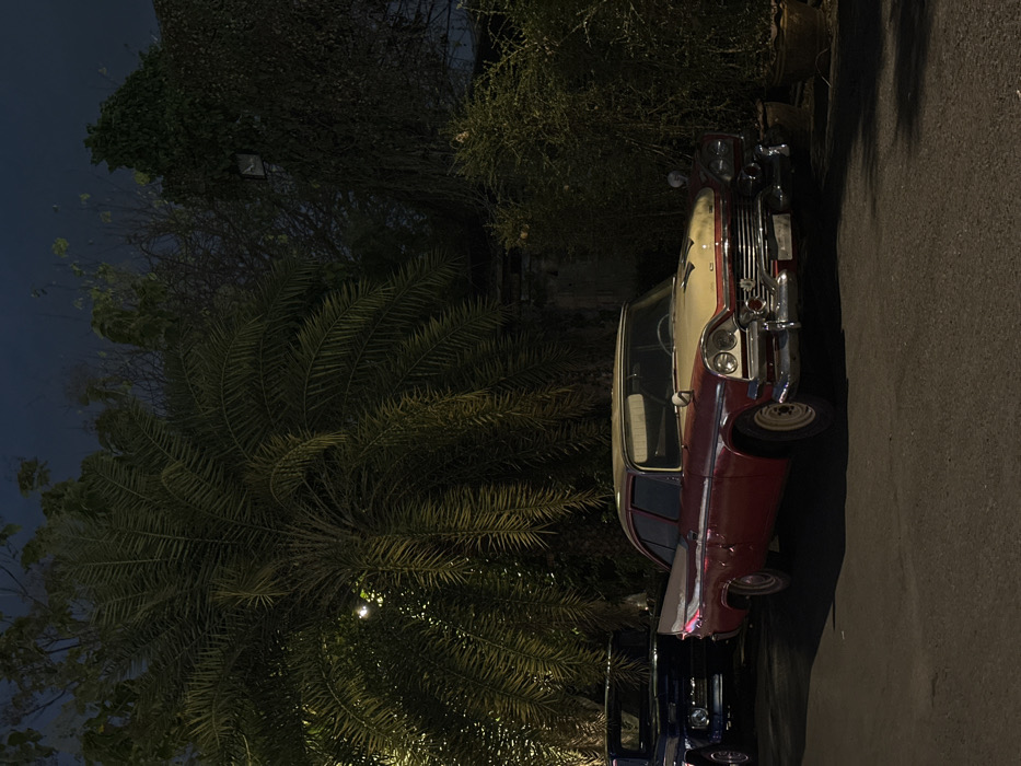 The image captures a static outdoor scene at night in Bangkok, Thailand. A two-tone vintage sedan, primarily red with a cream-colored hood and roof, is centrally parked on a dark paved surface. This vehicle features chrome bumpers, grille, and side mirrors, with prominent tail fins characteristic of a mid-20th century American design. Its paint exhibits visible wear and patina. Behind and to the left of the sedan, a dark blue vintage pickup truck is partially visible. Lush, dense tropical foliage, including a large palm tree with extensive fronds on the left and various bushes and trees, forms the background and surrounds the vehicles. Portions of the vegetation and the cars are illuminated by artificial light sources, casting shadows. The sky above is dark blue, consistent with nighttime. Several potted plants are visible on the ground to the right of the sedan. No human figures are present, and no actions or interactions are depicted. The scene suggests a stationary display or storage of classic vehicles within a verdant urban environment.