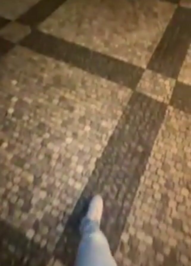 A person walks across a cobblestone plaza at night, showing the ground in front of them