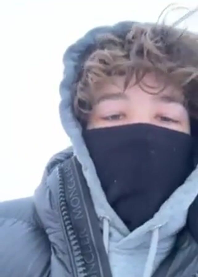 A person with curly brown hair and wearing a gray hooded sweatshirt, a black puffer jacket, and a black face mask is holding a camera. They are standing in a snowy, mountainous landscape with a cloudy sky. The person turns the camera slightly to the left, revealing more of the snowy terrain. The scene is windy.