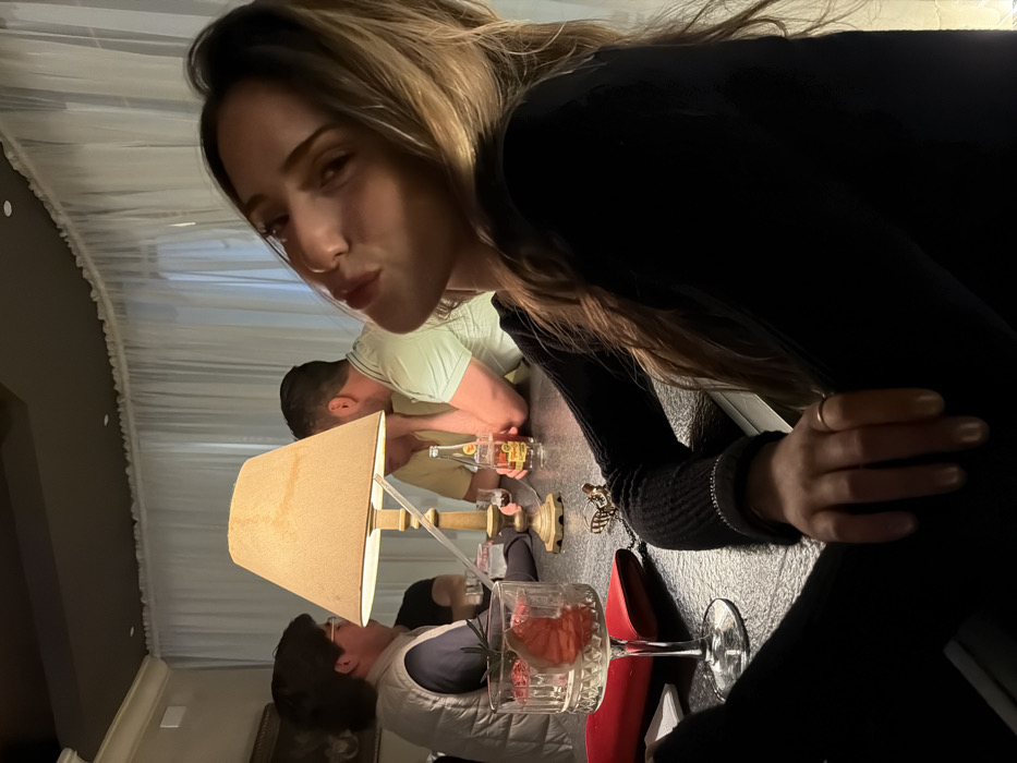 A woman with brown hair leans towards the camera, capturing a table scene with other people. Behind her, a man in a light green shirt leans close to another person. A lamp with a beige shade sits on the table next to bottles and glasses. Another person in a white vest is visible near a glass containing what appears to be grapefruit slices. A red napkin and a bee-shaped accessory also rest on the table. The background shows white, translucent curtains.