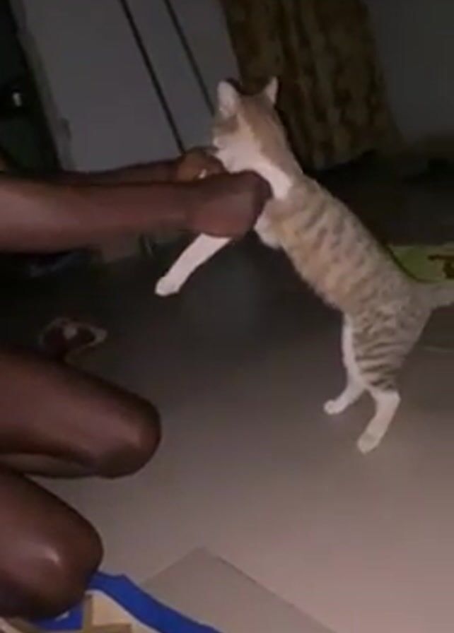 A person with dark skin kneels on the floor holding a gray tabby cat up by its front legs and under its chest. The cat is standing on its hind legs, and its front paws are dangling. A blue and yellow rug is visible in the lower part of the frame. The floor is tan tile. There are some objects blurred in the background. The lighting is dim.