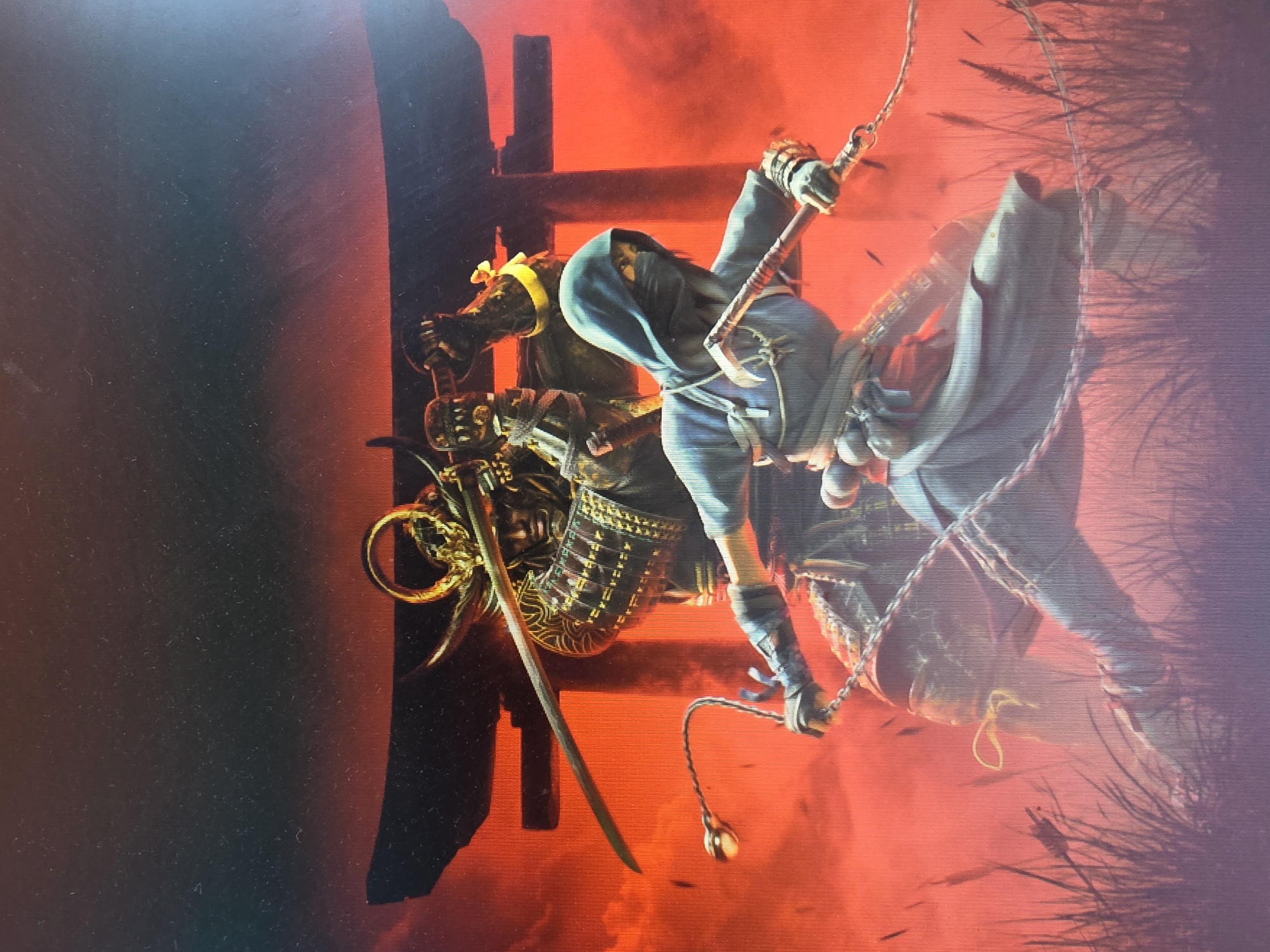 The scene is set in Drazhevo, Bulgaria. Two stylized figures are depicted in a confrontational stance within a dramatic, red-hued environment. In the background, a large, dark torii gate frames the upper portion of the scene. Behind the gate, the sky transitions from a fiery red at the horizon to darker red and black above. The foreground features silhouetted tall grass or reeds extending upwards from the bottom, partially obscuring the lower bodies of the figures. The rear figure, positioned slightly to the left, is a large, muscular warrior resembling a samurai or oni. This figure wears elaborate golden, horned armor, including a helmet, shoulder pauldrons, and chest plate, with dark and gold accents. They are dark-skinned and hold a katana with both hands, raised above their head in a striking posture. The front figure, positioned centrally and lower, appears to be a ninja. This figure is clad in a dark blue hooded garment that covers the head and lower face. They are in a dynamic, low combat stance, holding a kusarigama-like weapon in each hand, consisting of a sickle attached to a weighted chain. The chains are visible, extending around the figure's body. The ninja's visible eyes are focused forward. Both figures are positioned as if in mid-combat or preparing for an imminent clash, with the samurai-like figure poised for an overhead strike and the ninja-like figure in a defensive or counter-attacking posture.