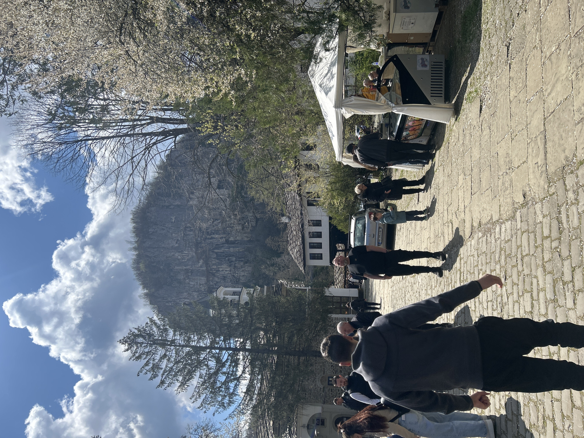 The scene is an outdoor public space in the city of Dryanovo, Bulgaria, characterized by a paved walkway and a backdrop featuring a prominent rock formation and a traditional white building with dark windows. A group of people, numbering more than ten, are present. They are primarily facing toward the building and rock formation. Some are gathered around a white tent-like structure, which appears to be a food or vending stall. The setting suggests a public gathering. The foreground features more people, some with arms outstretched. The sky is partly cloudy with patches of blue visible. The photograph is taken during the day, with significant shadows indicating the position of the sun. A silver car is also visible, partially obscured by the people.