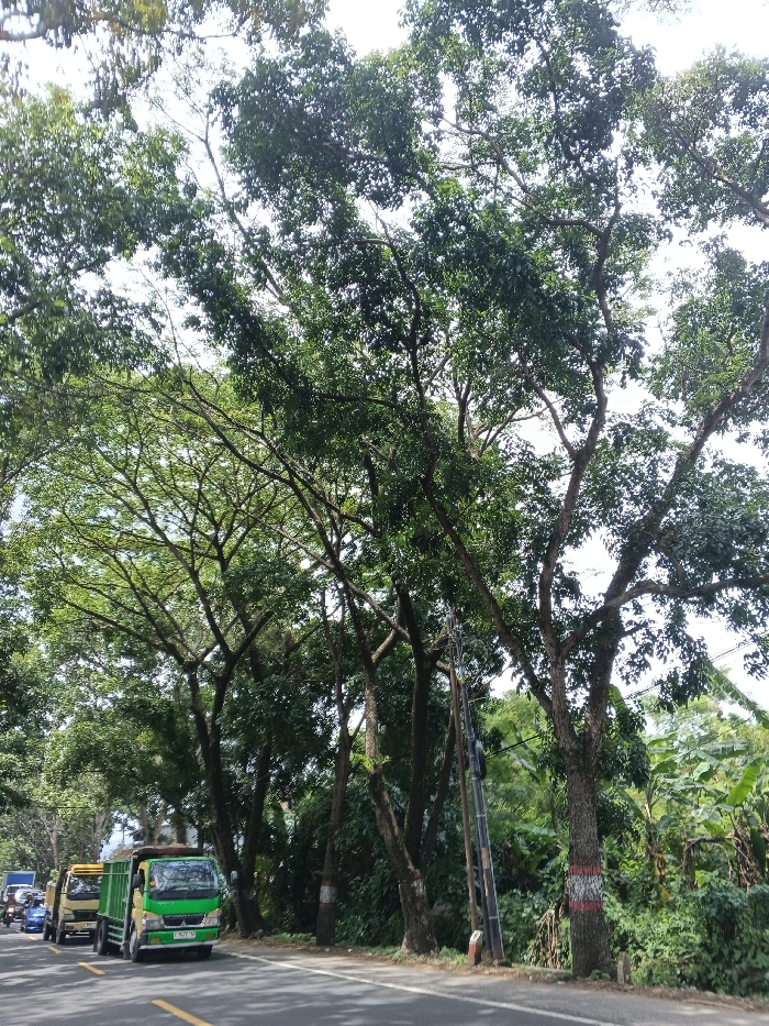 A road lined with tall trees provides a canopy overhead. Several trucks and motorbikes travel on the road. A green truck with a visible license plate is in the foreground. The tree trunks closest to the road have horizontal red and white markings. Power lines run along the side of the road among the trees. Lush green vegetation and banana trees grow behind the trees lining the road. The sky is visible through gaps in the tree canopy.