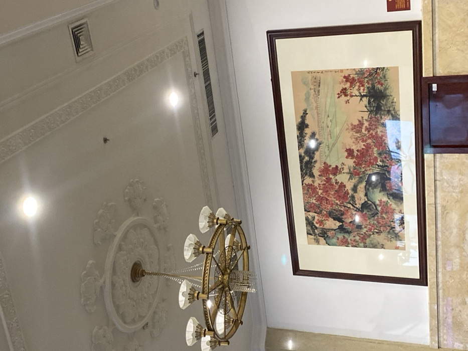 The image depicts an indoor scene within a building located in Dongcheng District, China. The primary focus is on a high ceiling and a section of a white wall adorned with a large artwork. The ceiling is white and features elaborate decorative molding. A large circular medallion with floral or cloud-like motifs surrounds the attachment point of a central chandelier. Additional linear decorative molding sections traverse the ceiling. Multiple recessed circular spotlights illuminate the space. Two rectangular air conditioning vents, one larger and one smaller, are visible on the ceiling, along with a small, dark, circular fixture, possibly a sensor or camera. A large, circular, gold-toned chandelier hangs from the ceiling. It possesses a central crystal drop and ten radiating arms, each terminating in a light fixture with a translucent, faceted shade, emitting a warm light. Below the ceiling, a white wall displays a prominent, horizontally oriented rectangular painting. The artwork, framed in dark brown wood, portrays a traditional Chinese landscape. The foreground features vibrant red blossoming trees and green, rocky formations. The background includes lighter-toned fields or water traversed by a bridge-like structure, with indistinct buildings in the distance. The painting's surface reflects ambient light sources. Below the painting, the lower section of the wall transitions to a horizontal band of beige or light brown marble-like material. A partial view of a dark brown, rectangular door is visible on the right side of the frame, set into the wall. A small red sign with white text is affixed to the white wall section to the right of the painting. No people, actions, or interactions are present in the scene.