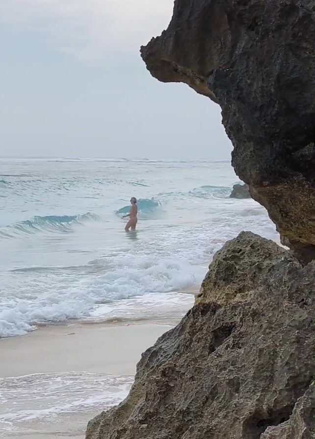 The scene is a beach, likely coastal. A person stands in the water with waves gently lapping around them. The person's gender is not clear. The water is a light, clear turquoise, and the sand is white. To the right, a large, dark, jagged rock formation frames part of the view. The sky is overcast. The waves appear small and the person is stationary in the shallow water.