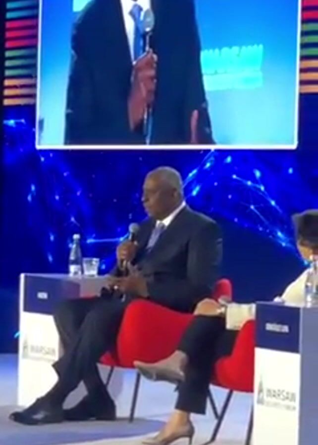 man speaking at a podium while another man sits next to a woman at a table on a stage. Behind them, a large screen displays the speaker's image, as well as the words "WARSAW SECURITY FORUM" in white lettering. The man seated at the table is wearing a suit and tie, and holding a microphone. The woman sitting next to him is wearing a light-colored jacket and pants. There is a bottle of water on the table. The set-up suggests a panel discussion or conference.