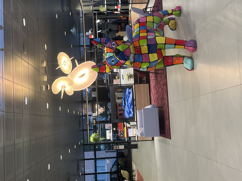 The scene is an interior view of a modern commercial establishment, identified as a BMW Motorrad dealership located in Turin, Italy, based on a reversed "BMW MOTORRAD" sign visible on a rear wall. The foreground features a large, static sculpture of a dog, approximately chest-height, composed of numerous glossy, multi-colored, rectangular segments in a patchwork pattern. The dog stands on a light grey tiled floor. The ceiling is a dark grey grid system fitted with multiple recessed spotlights and three prominent, white, multi-lobed pendant light fixtures. In the mid-ground, a seating arrangement is present, comprising a light grey two-seater sofa positioned on a rectangular dark red rug. Behind this, a wooden media console holds a flat-screen television displaying an image of a blue vehicle on a paved street. The background reveals structured display shelving containing various merchandise and small potted plants. Large glass window panels provide a partial exterior view of trees and building reflections. A portion of a red vehicle is visible beyond the sofa on the left. No human subjects are depicted.