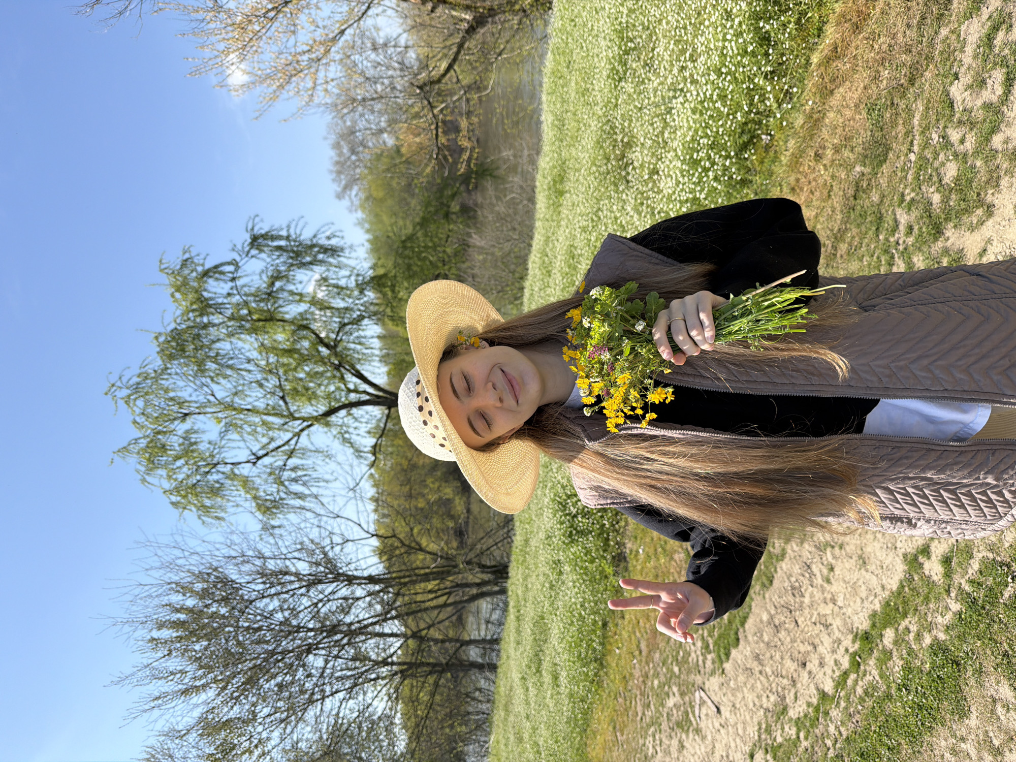A young woman in a straw hat stands in a field of flowers, holding a bouquet, with her eyes closed and a peace sign displayed. The background shows a blue sky, trees, and a river or lake. The location appears to be outdoors. There are no indications that this is in or near the city of Milevo, Bulgaria.