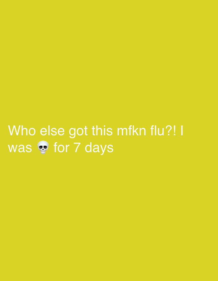 A graphic displays the text "Who else got this mfkn flu?! I was 💀 for 7 days" against a yellow background