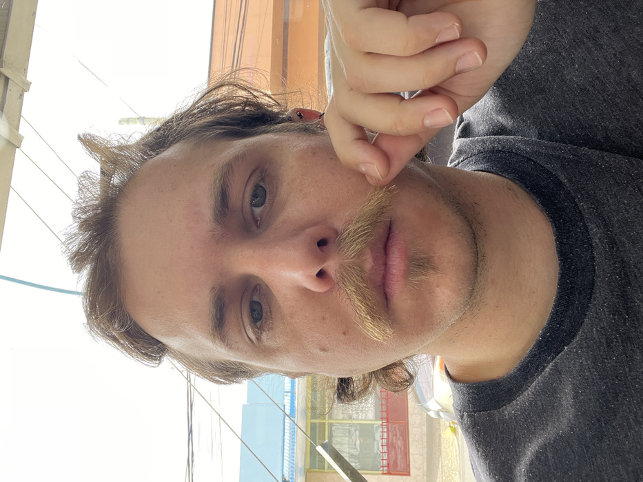 A fair-skinned man with light brown hair and a handlebar mustache gazes into the camera. He is pinching the ends of his mustache with his fingers. He wears a gray shirt. Background shows wires, a partial view of a blue building, and some sky. The photo is taken at an upward angle.