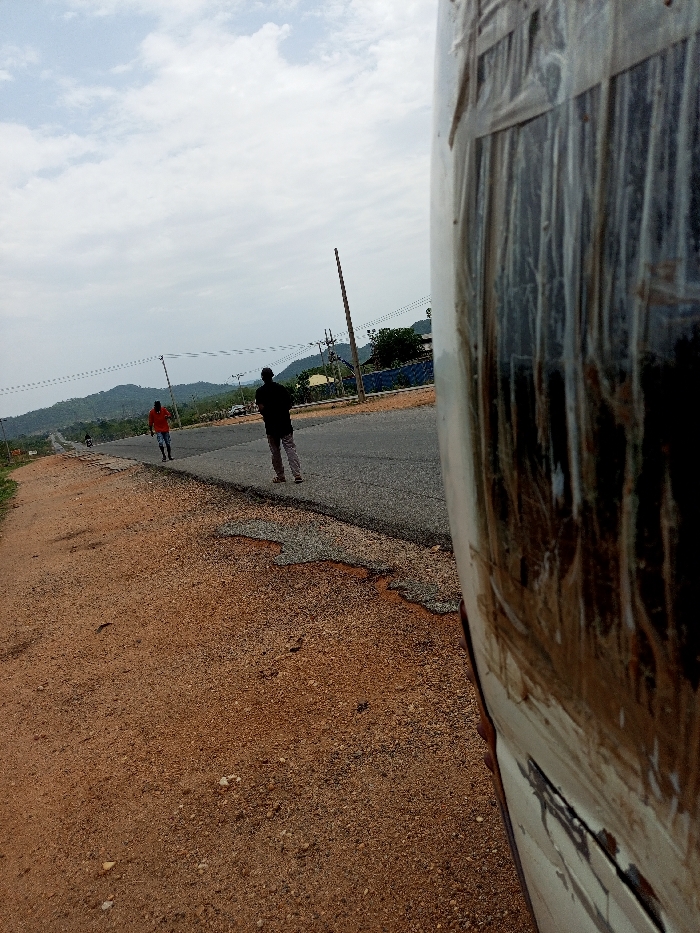 scene taken from a vehicle, looking out towards a road in Ohunene, Nigeria