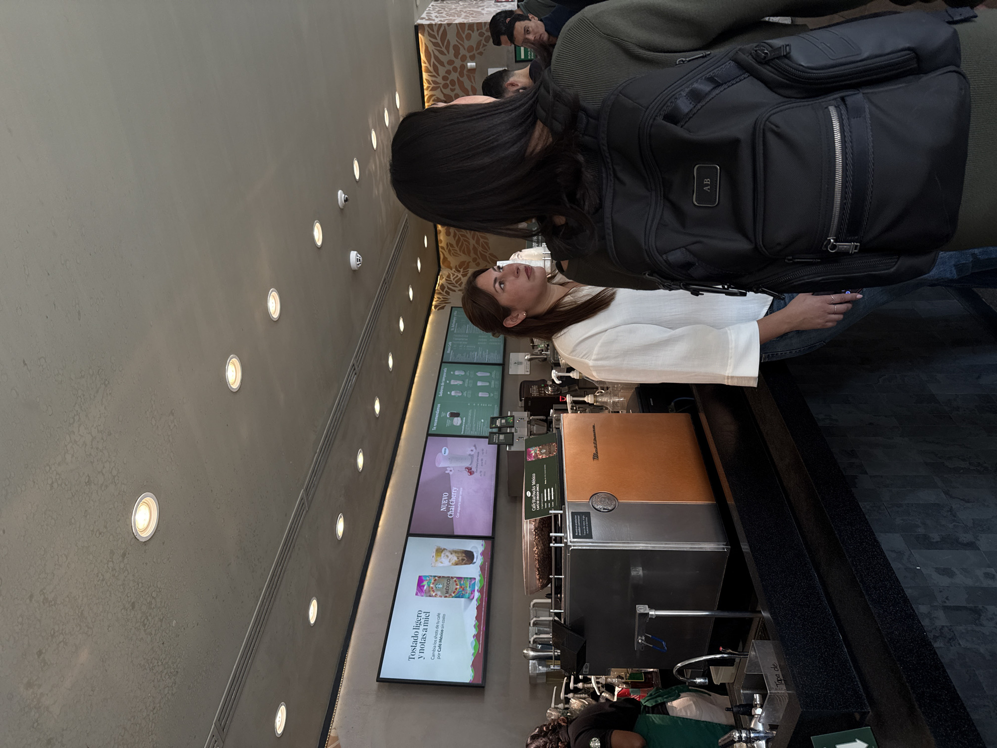 The scene depicts the interior of a Starbucks coffee shop located in San Agustín, Mexico. In the immediate foreground, the back of a person wearing an olive-green long-sleeved garment and a black backpack with a metallic "AB" monogram is visible. To the left of this individual, a woman with dark brown hair, wearing a white long-sleeved shirt and blue jeans, stands facing right, looking off-camera. Her left hand, adorned with rings, is partially visible. Behind these individuals, a long, dark speckled countertop runs horizontally, forming the service area. On the counter, a large stainless steel and copper-toned espresso machine is prominent, with a clear glass bowl filled with roasted coffee beans situated on its top. To the far left, a barista in a green apron is partially visible behind the counter, near a stainless steel sink and faucet. Above the service counter, three digital display screens are mounted on a dark grey wall. The screens show various promotions and menu items in Spanish, including "Tostado ligero y notas a miel" and "NUEVO Chai Cherry." A section of the wall to the right features a decorative, stylized brown and tan pattern. In the background, several blurred figures of other patrons or staff are discernible. The ceiling is a textured, light grey concrete, equipped with numerous recessed circular spotlights providing illumination, along with a white smoke detector and a small security camera. The environment indicates a contemporary and functional coffee shop setting.