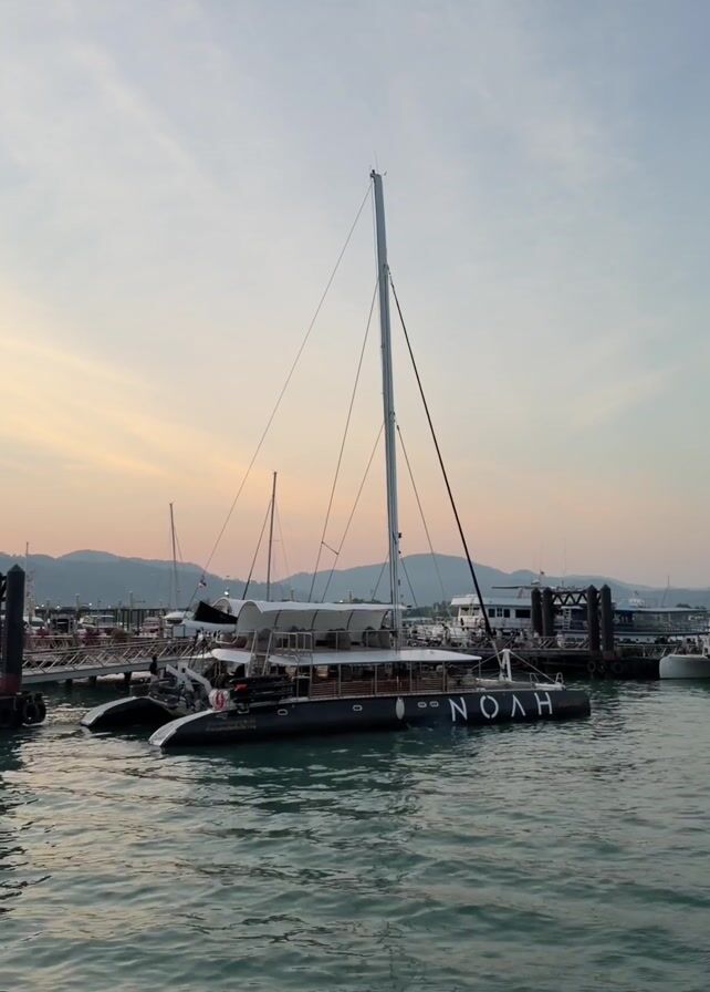 catamaran-style boat named "NOAH" moored in a marina. The boat is dark-colored with white lettering. It has a tall mast and a small, covered area on its deck. Other boats and docks are visible around the "NOAH". Mountains are present in the background under a sky transitioning from light blue to orange, indicating either sunrise or sunset. The water is slightly rippled. A few voices can be heard speaking in the background.