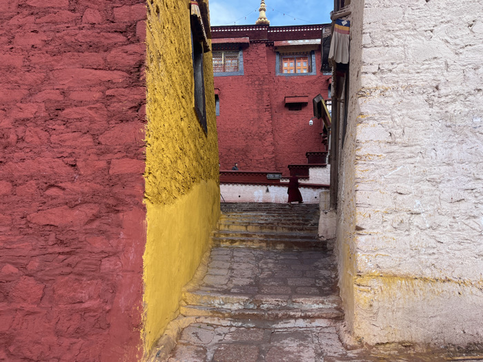 The image depicts a narrow, ascending stone stairway within the Potala Palace complex in Lhasa, China, framed by textured walls. In the left foreground, a roughly mortared stone wall is painted a vibrant deep red, meeting a perpendicular section of textured wall painted bright yellow. On the right, a rough, off-white, weathered wall forms the other side of the passage. A single individual, dressed in a long, dark red robe characteristic of a monk, walks uphill on the uneven stone steps, facing away from the viewer, towards the background. Beyond them, a multi-storied building with a deep red facade and multiple dark-framed windows featuring decorative grates rises, built upon white foundational levels. At the upper left, a golden roof finial is visible against a blue sky with scattered clouds. A vertically striped fabric banner hangs from the structure on the right side of the passage.