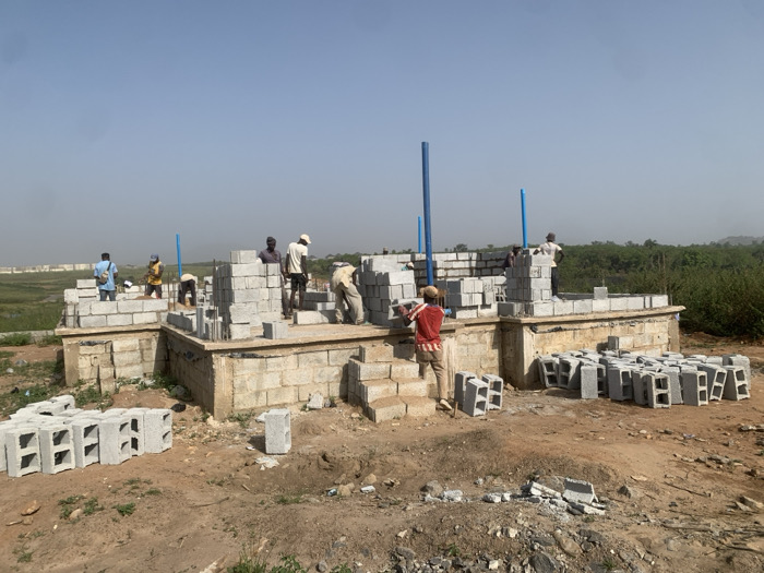 The image displays an active construction site in Karsana 2, Nigeria, under a clear, hazy sky