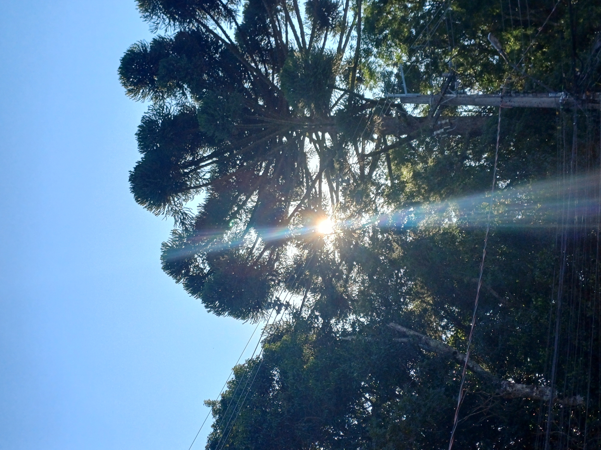 The image displays an outdoor scene in Curitiba, Brazil, featuring a clear, light blue sky in the upper portion. The sun is visible as a bright light source in the upper-right quadrant, partially obscured by foliage, producing a prominent starburst effect and lens flares that extend diagonally across the frame. A large *Araucaria angustifolia* (Paraná Pine) tree dominates the right side, characterized by its distinctive tiered branches and dense, dark green, scale-like foliage clusters. Additional green trees with more conventional canopies are present on the left and in the background. Multiple black utility lines are strung horizontally across the mid-ground, with a grey utility pole supporting these lines and a curved street light fixture visible in the lower right, partially concealed by the surrounding vegetation. No individuals or animals are present.
