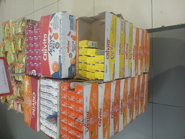 The scene depicts an indoor retail display in a supermarket or grocery store, located in Barden Yana, Nigeria. The central focus is a multi-tiered display of stacked cardboard boxes containing Chivita brand juice products. On the left, a vertical stack consists primarily of Chivita Happy Hour juice in orange-branded cartons. Above this stack, an open box reveals numerous individual white-packaged juice cartons. To the right, a large white and red cardboard box for "Chivita Active Zest," featuring orange and grapefruit imagery, is prominently displayed. Below it, a stack of Chivita Oyoyo juice boxes in yellow packaging is visible, with individual yellow-packaged cartons showing inside an open box at the top. In the background, behind the juice boxes, a shelf holds multiple small, commercially packaged food items, likely snacks such as plantain chips, contained within clear plastic bags. A red-framed sign, partially visible at the top, bears the text "find more, pay less." The floor beneath the display is a light-colored tile. No individuals are present in the image, and no actions or interactions are depicted beyond the static arrangement of merchandise.