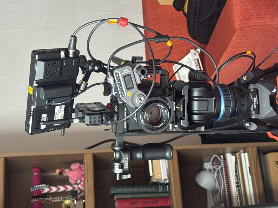 A professional camera rig is mounted on a shelf filled with books and accessories. The rig includes a Red Digital camera body with a Nikon lens and Sirui components. A Nucleur unit is attached, and a DV1000 device is visible at the back. The rig is connected to a World transmitter with a battery pack and antenna. Books like "The Song of Achilles" and "One of Us is Lying" are on the shelf, and a red couch can be seen in the background.