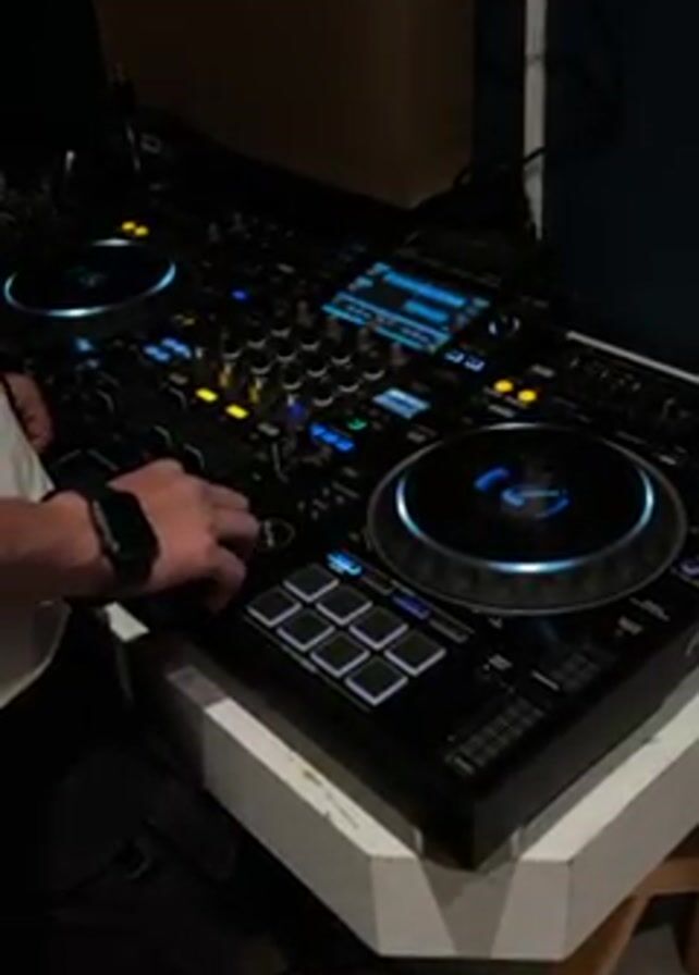 person operating a Pioneer DJ controller. The controller is black with blue and yellow lights. The person is wearing a white shirt and black pants, and a watch on their left wrist. Their left hand is turning a knob on the controller. The background is dark with a glimpse of a wooden wall. The controller is sitting on a white table.