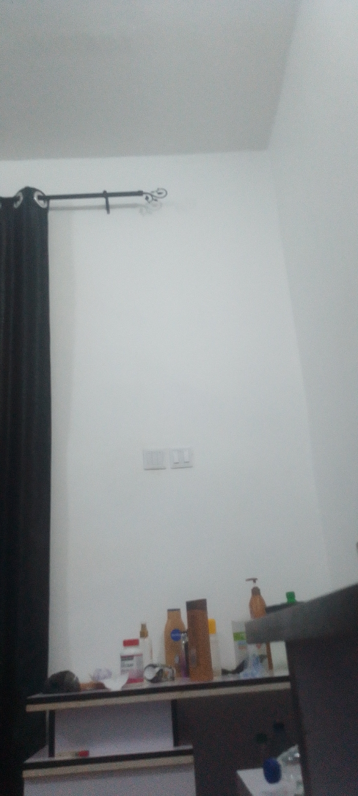 The image depicts the interior of a room in Tuaniako, Nigeria. The scene is dominated by a white wall, on which two white electrical light switches are mounted horizontally in the mid-upper section. To the far left, a dark, likely black or deep grey, curtain hangs from a black metal curtain rod with decorative finials. In the lower portion of the frame, a multi-tiered dresser or table is visible, featuring a light-colored top surface with a dark trim and a darker lower section. The top surface of the dresser holds multiple assorted bottles and containers, consistent with personal care products, including tall brown bottles, a yellow or beige pump bottle with a blue label, a white bottle with a red cap, and other assorted plastic and potentially glass containers. Other small, indistinct items, including crumpled paper and a metallic object, are also present on the dresser. No people are visible, and no actions or interactions are depicted. The environment appears to be an organized domestic setting.