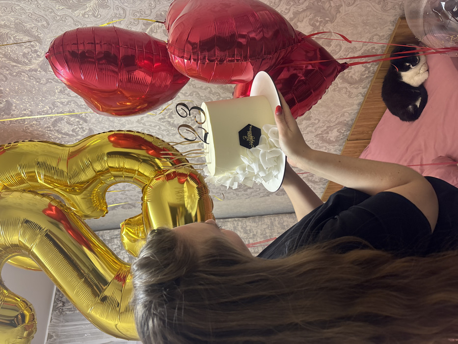 A person holds a cake with "23" in wire on top. The cake has white ruffled decorations and a black, hexagon-shaped label. Red heart-shaped and gold number balloons surround the scene. A black and white cat is visible, curled up on a pink pillow in the background. The individual is wearing a black shirt and has long brown hair. A patterned wall serves as the backdrop.