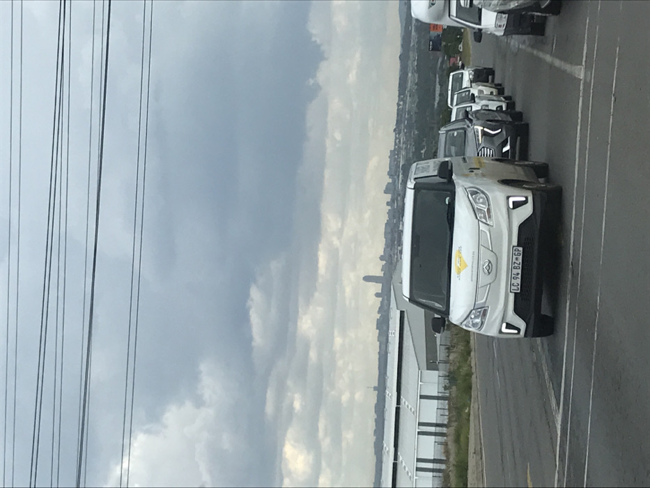An overcast daytime scene captures a line of vehicles on an asphalt road in Midrand, South Africa, with the distant Johannesburg skyline visible on the horizon. The sky is predominantly grey with extensive cloud cover, traversed by multiple parallel overhead power lines. In the immediate foreground, a white electric delivery van, bearing the South African license plate "LC 94 BZ GP" and a yellow triangular logo on its hood, is positioned slightly left of center, facing the viewer. Its integrated LED daytime running lights are illuminated. Directly behind this van, a dark grey SUV is visible, followed by a queue of several other vehicles, including cars and vans, extending into the mid-ground towards the right side of the frame. The front section of another white vehicle is partially visible on the far right edge. To the left of the road, in the mid-ground, a series of industrial buildings with white roofs and grey walls are present, separated from the roadway by a strip of dry, sparse vegetation. To the right, a vegetated hillside is visible, along with a distant, partially obscured billboard. The background features a clear silhouette of the Johannesburg city skyline, including numerous buildings of varying heights and a distinct tall structure, consistent with the Hillbrow Tower. No individuals are discernibly visible; the scene depicts vehicles in a state of stationary or slow-moving traffic.
