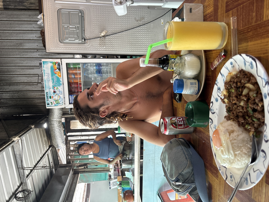 An outdoor eatery in Ko Tao, Thailand, is depicted with two individuals and a meal on a wooden table. In the foreground, a young adult male with curly light-brown hair and a nose ring sits shirtless at a table, looking to his right. His right hand is raised to his face, with fingers near his nostril, possibly holding a small object. He wears a thin silver chain. On the table directly in front of him is a plate containing white rice topped with a fried egg and a portion of minced meat stir-fry with onions and herbs. A spoon rests on the plate. To his right are a tall glass with a yellow beverage and a green plastic straw, a red and black disposable lighter, and a clear glass object. To his left is an open silver can of LEO beer, a green ceramic ashtray, and a grey fabric fanny pack with a blue strap. A small white plate holds various condiments: a blue-capped shaker, a clear glass shaker with white contents, and a small bottle of dark liquid. In the midground, behind the male, an adult female with dark hair pulled back, wearing a blue tank top, stands in a kitchen area. She is looking towards the seated male, with her hands engaged over a counter. The background reveals a casual setting with corrugated metal walls and roof. A white "SANDEN Cold Fresh" refrigerator stocked with beverages is visible behind the male. A metal ventilation duct is overhead. Exposed electrical wiring is also visible. The counter in the kitchen area is light blue. Through an opening behind the female, another structure or outdoor scene is partially visible.