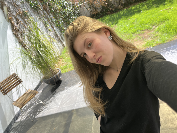 A young woman with long, blonde hair takes a selfie outdoors on a sunny day. She wears a black V-neck sweater and silver earrings. Behind her is a white wall covered in vines, a potted plant with long leaves, and a small wooden chair casting a shadow. A patch of green lawn is visible in the background. The ground appears to be concrete.