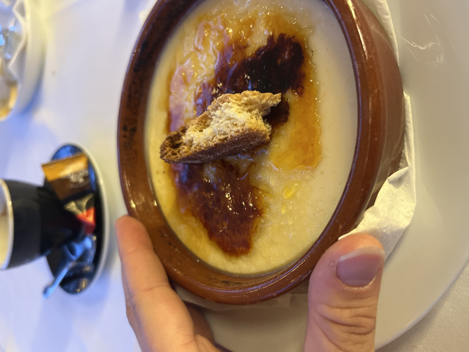 A close-up photograph displays a human hand, specifically the thumb and index finger of the left hand, grasping the rim of a round, brown ceramic bowl. The bowl contains a pale yellow, creamy dessert, identified as Crema Catalana, topped with irregular patches of glossy, caramelized sugar ranging from amber to dark brown. A single piece of a light brown, rectangular biscotti or similar cookie is partially submerged upright in the dessert, near the center-right. The ceramic bowl rests on a white ceramic plate, with a crumpled white paper napkin positioned between the bowl and the plate. In the blurred background, a black coffee cup on a black saucer is visible, accompanied by a small spoon, a brown sugar packet, and a small dark chocolate square. The scene is set on a white tablecloth, consistent with a dining establishment in Lloret de Mar, Spain.