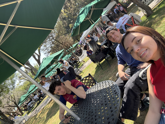 Three young people sit at a black metal table under green umbrellas on a sunny day. One wears a Barcelona jersey, another a blue shirt, and the third a red shirt. They are on a grassy area with trees and other people seated at tables in the background. The person in the red shirt is taking a selfie.