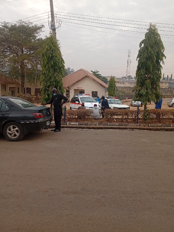 A scene in front of a building labeled "MORTUARY". A black sedan parked on the left. A man in black attire and a face mask stands beside the car. Two white vehicles with red and blue lights on their roofs are parked in front of the mortuary. A group of people is gathered near the vehicles. Tall, slender trees flank the building. A utility pole and a tall communication tower rise in the background against an overcast sky.