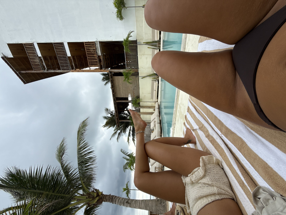 The image depicts an outdoor poolside scene in Kathaluwa, Sri Lanka, observed from a low perspective. In the foreground, the legs and lower torso of two individuals are visible, both lying down on striped beach towels (white and light brown). The person in the immediate foreground, positioned to the right, has tanned skin and wears dark brown bikini bottoms. To the left, the second individual, also with tanned skin, wears light-colored knit shorts, a silver anklet on the left ankle, and has a small tattoo on the outer left thigh. Beyond the individuals, a light blue swimming pool occupies the mid-ground, surrounded by several light-colored lounge chairs and seating arrangements. Palm trees are scattered throughout the background. To the left of the pool, a rustic, single-story structure with a thatched roof and bamboo or wooden walls is visible. To the right of the pool, a prominent multi-story white building with wooden balconies and railings extends upwards, topped with a wooden A-frame roof. The upper sections of this building appear to have an unfinished or raw wooden aesthetic. The sky above is overcast with grey clouds.