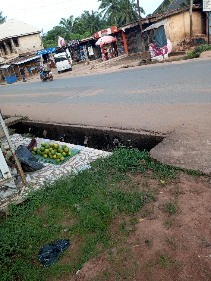 The image depicts a street scene in Oko Town, Nigeria, captured from a low perspective. In the immediate foreground, a patch of reddish-brown soil is covered by sparse green grass, with a crumpled black plastic bag resting on the dirt. Adjacent to this, a concrete curb transitions to a tiled sidewalk. A dark, concrete drainage channel, approximately 0.5 meters wide and containing visible debris, separates the sidewalk from the main road. On the tiled sidewalk, the lower legs and bare feet of an individual, presumably a vendor, are visible on the far left. A pile of approximately two dozen green and yellow citrus fruits, consistent with oranges, is displayed on a green fabric mat next to the individual. The midground features a two-lane asphalt road with visible cracks and patches. A white van is parked or moving slowly towards the background on the right side of the road. A person on a brown motorcycle is driving away from the viewer in the right lane. Another individual is standing on the far left side of the road, partially obscured by a building. The background consists of a commercial strip with multiple single-story buildings housing shops or stalls. Noteworthy features include a shop with a prominent red "JUICE" sign and an open pink sun parasol positioned outside its entrance, and another shop displaying blue signage. Further down the street on the left, a two-story building with an unpainted or unfinished upper level is visible. The scene is set against a backdrop of dense green foliage, including palm trees, with a pale, diffused sky overhead.