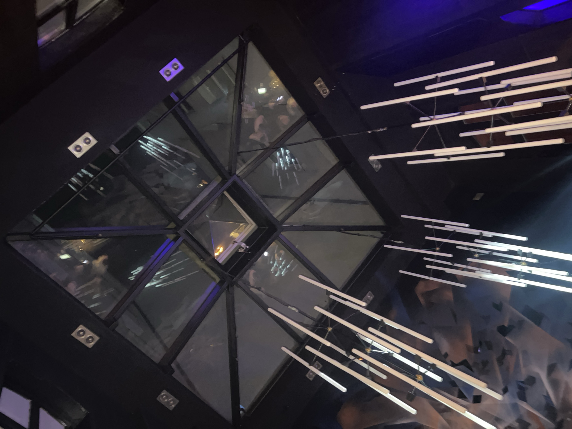 This image depicts an upward-angled view of a ceiling within the Berlin Dungeon attraction in Berlin, Germany. The central ceiling feature is a large, inverted glass pyramid composed of multiple triangular and trapezoidal glass panels set within a dark framework. Reflections of approximately five to ten indistinct human figures are visible within these glass panels, suggesting their presence in a different section of the building. Surrounding the glass pyramid are flat black ceiling panels, into which multiple rectangular light fixtures are recessed. Each fixture contains two circular lights; some emit white light, while others display a purple illumination. Hanging from the dark ceiling are two prominent light installations, each comprising numerous vertically oriented, illuminated white tubes of varying lengths, suspended by thin wires. The background on the lower right features a dark surface illuminated by a blue-purple light. The lower left of the image reveals a textured, light-colored backdrop with dark, irregular patterns.