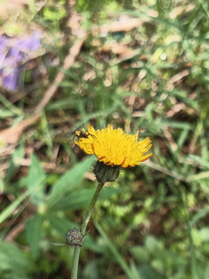 A vibrant yellow flower is the focal point against a blurred green background. A tiny insect, possibly a small spider, rests on the flower's edge. The flower blooms atop a slender green stem. Further down the stem, there's another closed flower bud. The surrounding greenery creates a soft, bokeh-like effect, giving the image a sense of depth.