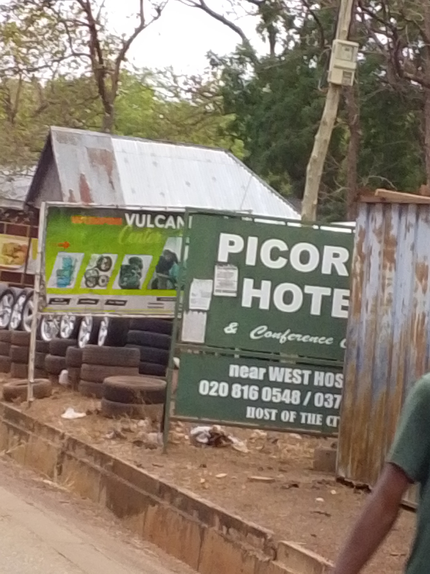 roadside scene in Tamale, Ghana. A sign for "Vulcan Center," a vulcanizing shop offering tire repair services, stands next to a sign for "Picor Hotel & Conference Center." A stack of used tires is placed in front of the Vulcan Center sign, with silver and black rims visible. The Picor Hotel sign indicates its proximity to "West Hos[pital]," including phone numbers. Debris is scattered on the ground, and a corrugated metal structure is positioned near the Picor Hotel sign. A utility pole is visible to the right of the frame. The edge of a person's arm and shoulder are visible. In the background is a building with a corrugated metal roof. The sky is overcast, and the trees are green.