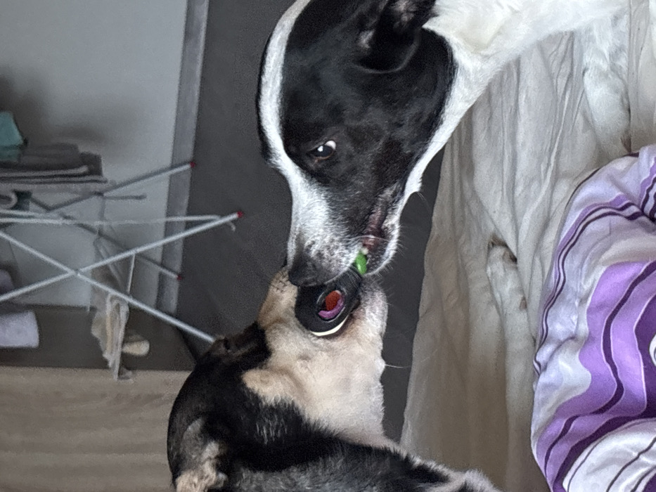 The scene is an interior room located in the city of Haskovo, Bulgaria. Two domestic dogs are depicted in close proximity, engaged with a singular black rubber chew toy. The dog on the left exhibits a black and tan coat pattern, with its muzzle grasping one end of the toy, which displays a reddish-purple interior through an aperture. The dog on the right features a black and white coat with a distinct white stripe extending along its facial midline; it holds the opposing end of the toy, with a small green object partially visible within its oral cavity near its teeth. The animals' heads are oriented towards each other, indicating a direct interaction with the object. The immediate foreground includes a purple and white striped duvet cover. The background consists of a plain light-colored wall, a white metal clothes drying rack laden with various laundry items, and a dark grey floor surface, consistent with a residential interior.