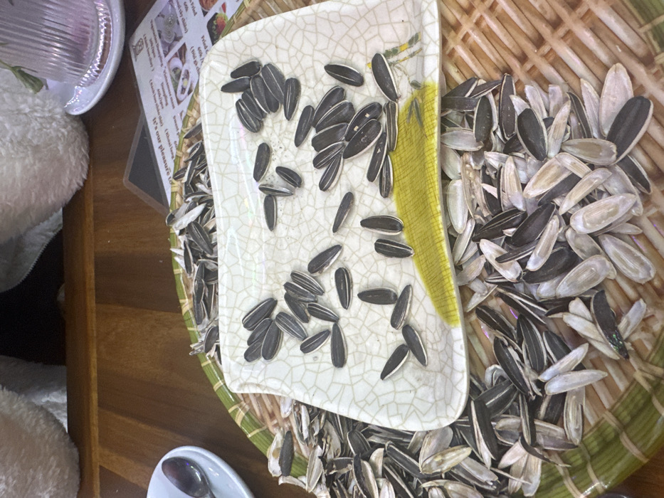 The image displays a close-up, elevated view of a table in what is identified as Hà Nội, Vietnam. Dominating the center is a rectangular, off-white ceramic dish, featuring a cracked glaze pattern and a yellow-green stylized stripe at one end. This dish contains approximately 50 whole, striped sunflower seeds. The dish rests on a round, woven bamboo or rattan tray with a green edge. The tray is largely covered with a dense accumulation of discarded sunflower seed shells, indicating active consumption. In the upper left, a portion of a white saucer with a metal spoon is visible on a dark wooden table surface. To the upper right, a blurred white, fluffy texture is present, along with a partially visible clear, ribbed glass containing a purple liquid, resting on a white saucer. A menu or informational sheet with text, including the phrase "It's our pleasure to," is partially visible beneath the glass. The scene suggests an informal dining or social setting.